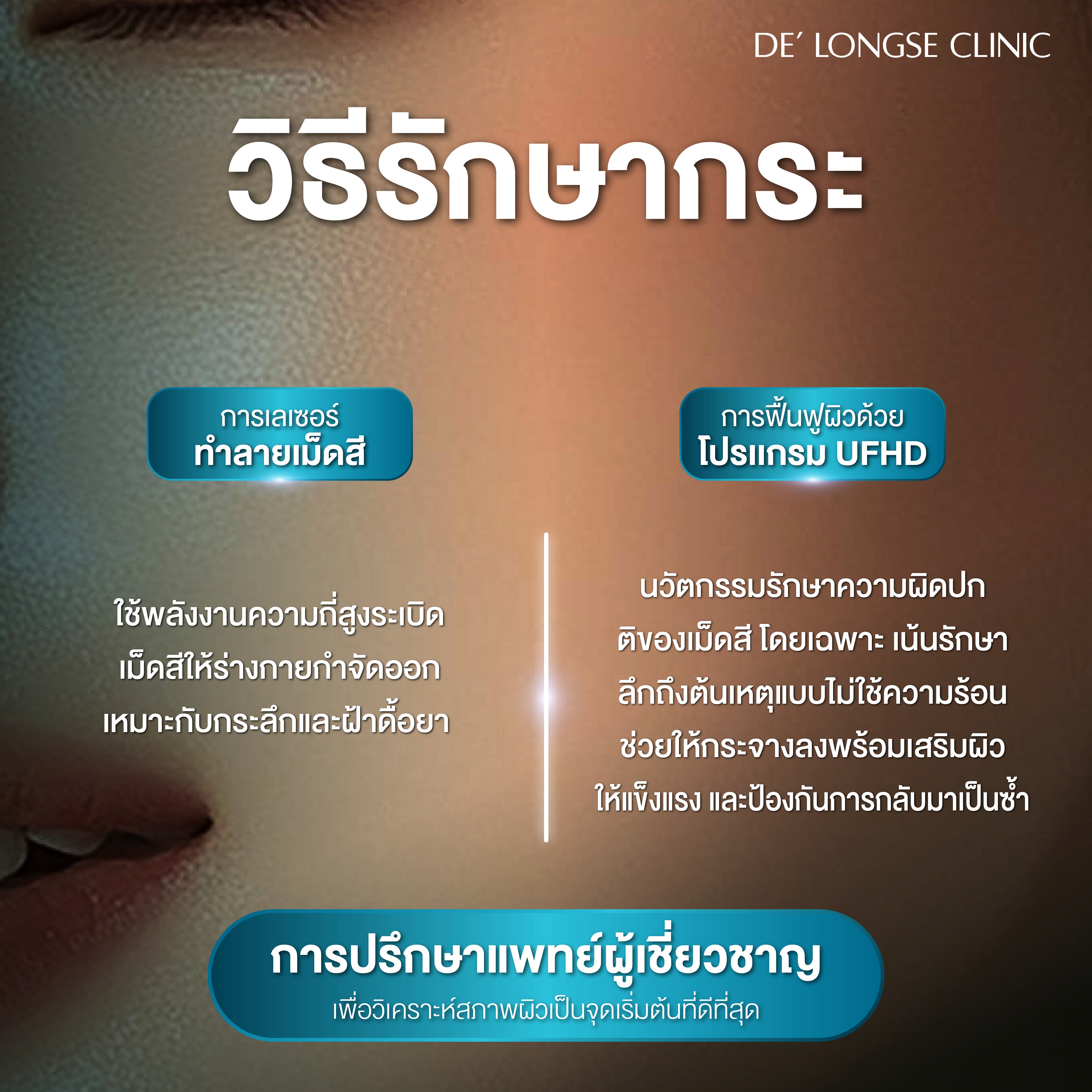 โปรเเกรมการรักษา ความผิดปกติของเม็ดสีบนใบหน้า (กระลึก) เเละ ( กระตื้น ) ที่ทำให้สีผิวบริเวณใบหน้าไม่สม่ำเสมอ เกิดได้จากเม็ดสีผิว (เมลานิน) มากเกินไป ทำให้เกิดรอยดำ หรือน้อยเกินไปทำให้ผิวขาวซีดกว่าปกติ ภาวะนี้อาจไม่ร้ายแรง แต่ส่งผลต่อความงามและจิตใจของผู้ป่วยได้ จึงควรพบแพทย์เพื่อวินิจฉัยและรักษาอย่างเหมาะสม