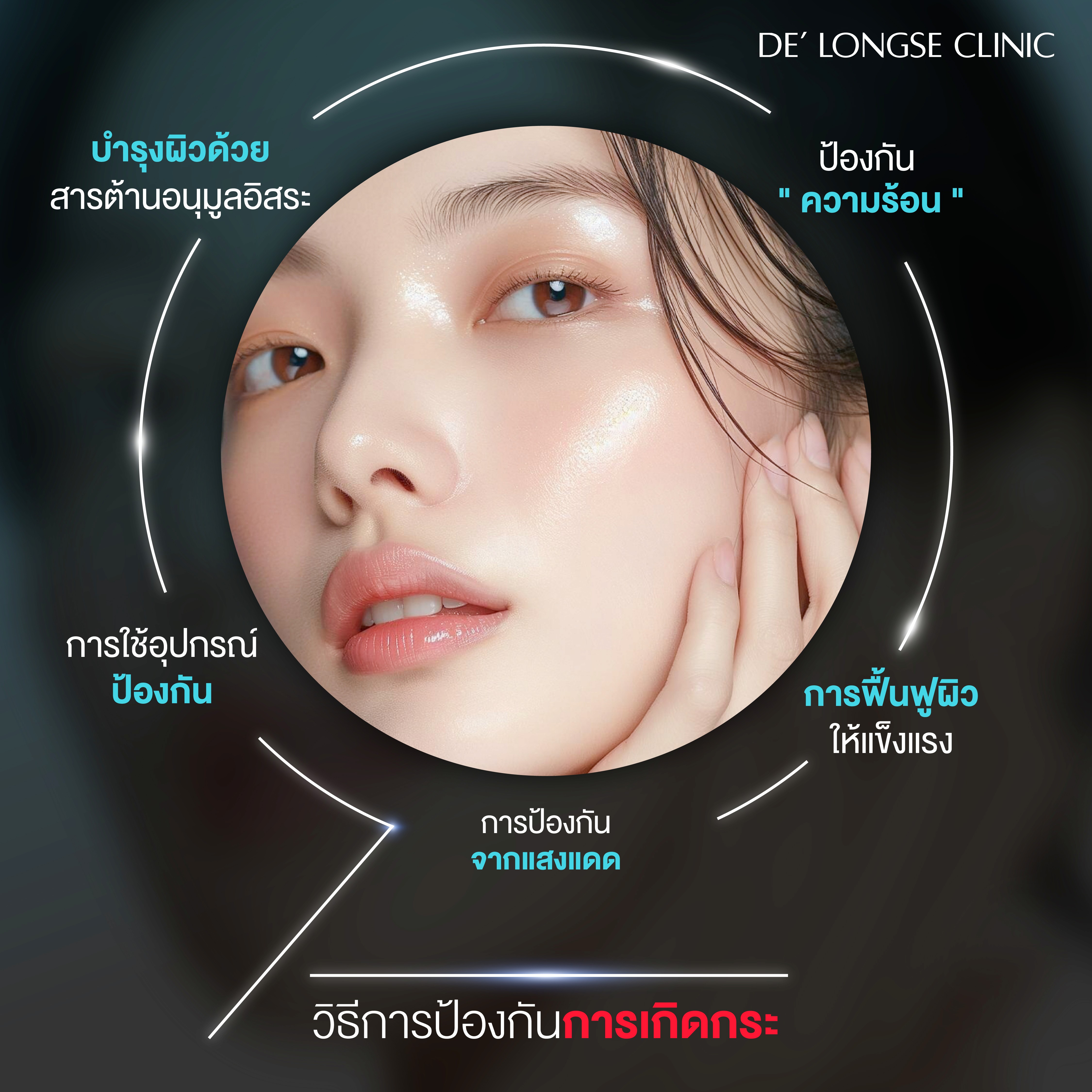 เสื้อผ้าและอุปกรณ์: สวมหมวกปีกกว้าง กางร่มที่เคลือบสารกัน UV หรือใส่แว่นกันแดดเพื่อปกป้องผิวบอบบางรอบดวงตาและโหนกแก้ม (จุดที่เกิดกระลึกได้ง่ายที่สุด)
